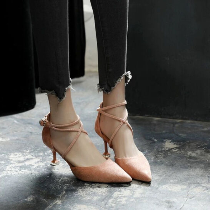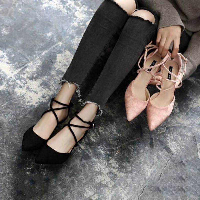 尖头细跟绑带百搭少女黑色高跟鞋(图1)