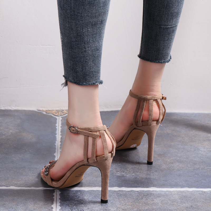 网红水钻露趾凉鞋女镂空2020夏季新款一字扣带仙女风高跟鞋女细跟